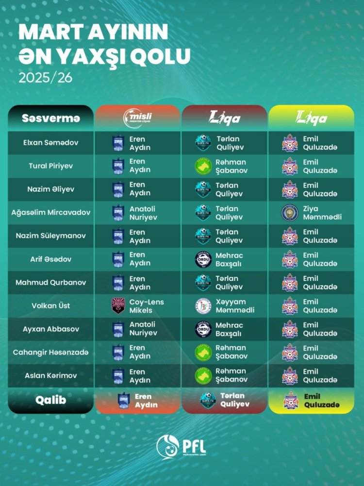 Peşəkar Futbol Liqasının təsis etdiyi "Ayın qolu" layihəsində mart ayının ın qalibləri müəyyənləşib.