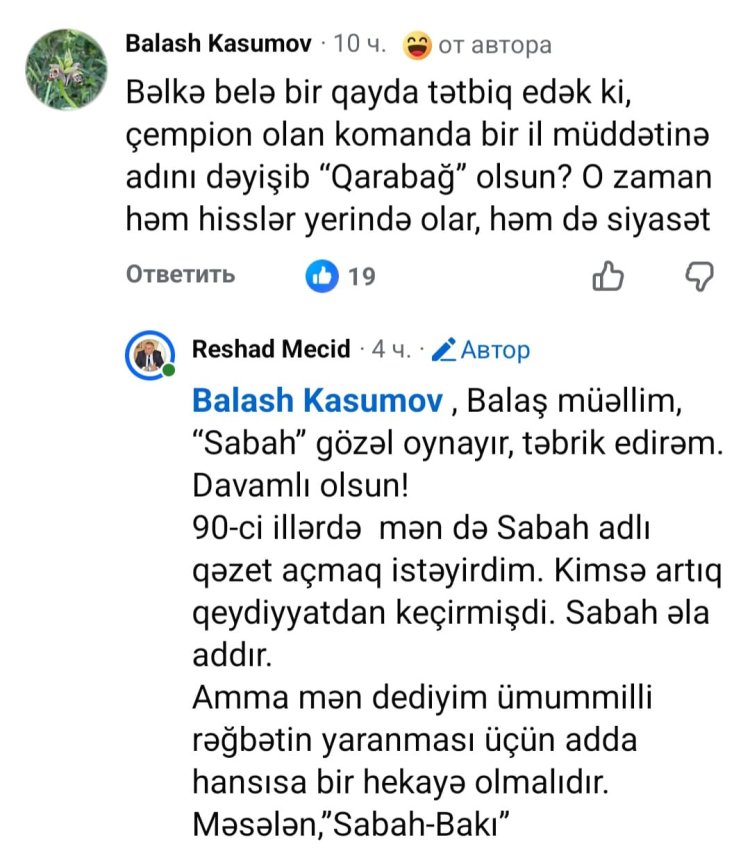 "Bəlkə belə bir qayda tətbiq edək ki, çempion olan komanda bir il müddətinə adını dəyişib “Qarabağ” olsun? O zaman həm hisslər yerində olar, həm də siyasət".