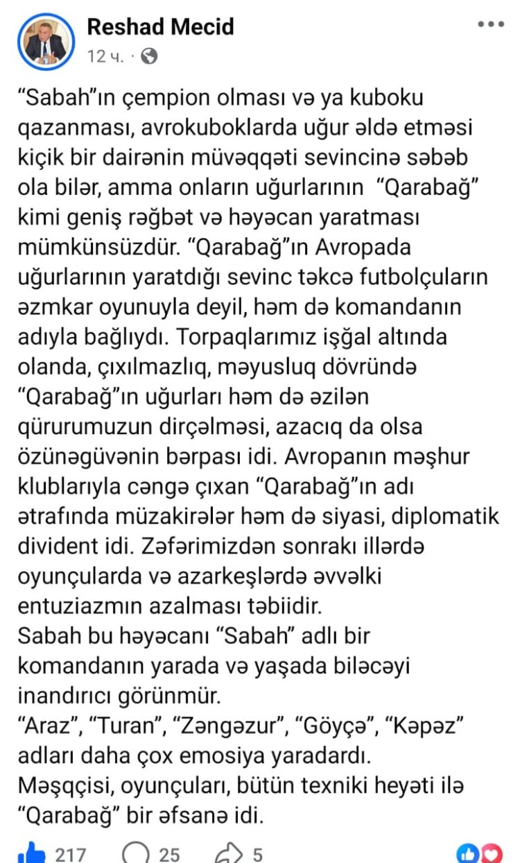 Azərbaycan Mətbuat Şurasının sədri Rəşad Məcidin "Sabah" klubunun adının çox da uğurlu olmaması ilə bağlı statusu birmənalı qarşılanmayıb.