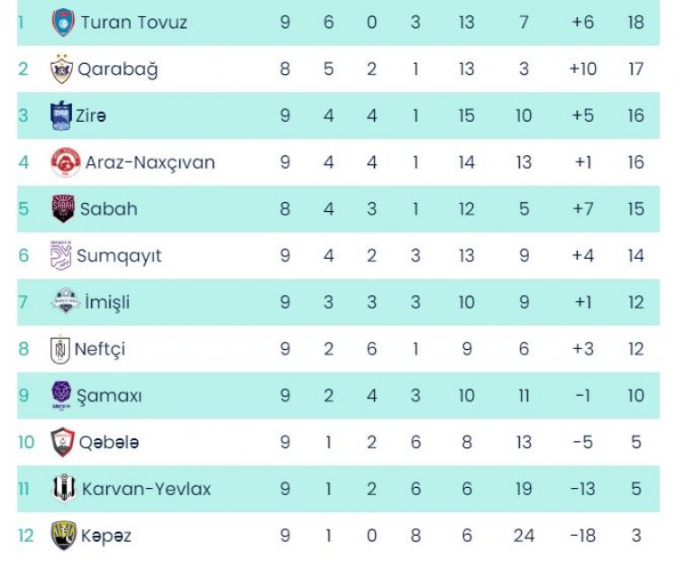Xatırladaq ki, turun əvvəlki görüşlərində "Turan Tovuz", "İmişli" və "Zirə" qələbə qazanıb, "Araz-Naxçıvan"la "Sabah" bərabərə qalıb.