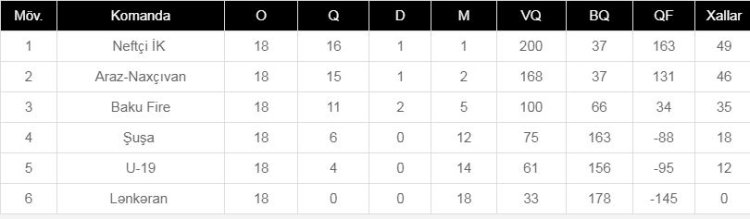 Son çempion “Araz-Naxçıvan” isə 3 xalı meydana çıxmadan qazanıb. “Lənkəran” daha əvvəl yarışdan kənarlaşdırılıb.