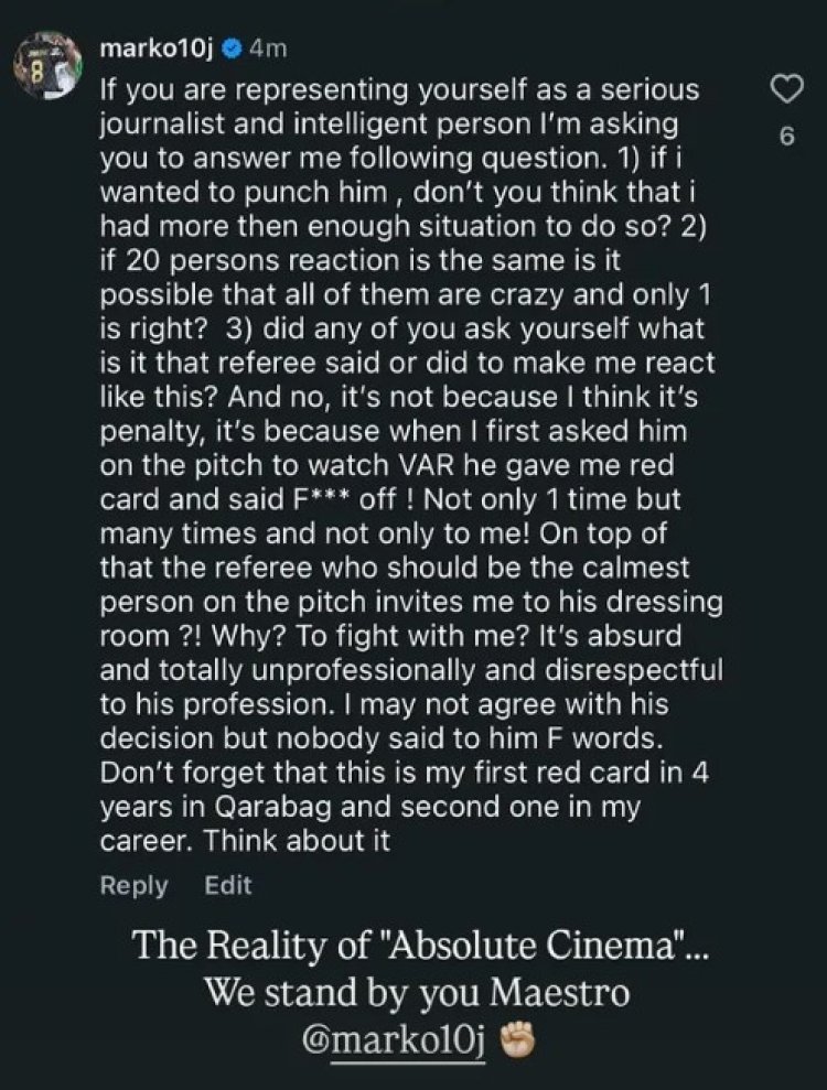 Unutmayaq ki, bu mənim 4 illik “Qarabağ” karyeramda ilk, ümumi karyeramda isə ikinci qırmızı vərəqə idi".